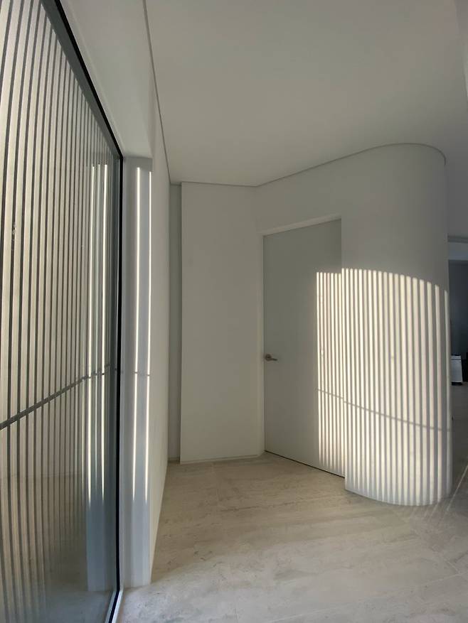 오후에 거실에 앉아서 밖을 보면 서쪽에서 해가 깊게 루버문을 통해 들어옵니다. 그 모습이 신비해서 한참을 감상하게 돼요.