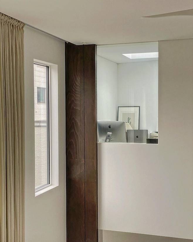 침대가 자리하는 벽면에 직사각형의 긴 창도 만들었어요. 답답한 게 싫어서 창이 많은 방이 되었습니다. 쉼과 독서나 간단한 업무를 볼 수 있는 작은 서재와 함께 하는 침실을 생각해 보았어요.