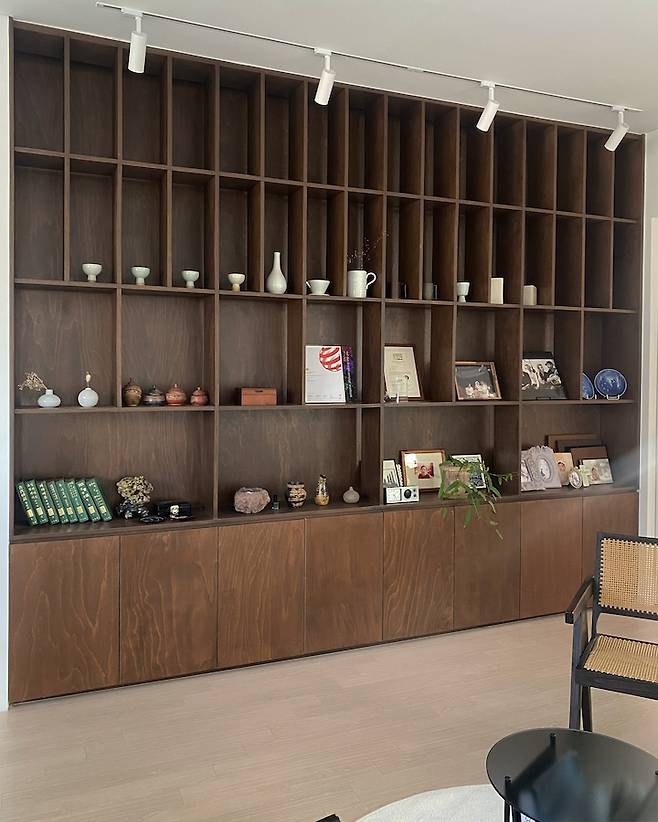 오픈 수납장의 경우 잘못 수납하면 정돈이 안 되어 보일 수 있어요. 꼭 필요한 오브제나 물건만 진열합니다. 핀 조명을 설치하여 밤에는 갤러리의 느낌을 더 했습니다.