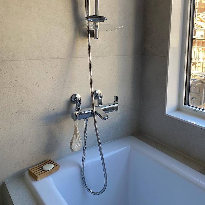 이층 욕실에서 반신욕을 하면 오른쪽 큰 창으로 밖의 풍경을 감상할 수 있어요. 지금은 이웃집이 있어서 쉽진 않습니다. 목욕용품을 두기보다는 비누 하나로 깔끔하게 유지합니다. 좋은 비누 하나면 다비솝과 샴푸바 기능을 다 할 수 있어요. 환경과 인테리어 둘 다 만족할 수 있어서 좋습니다.