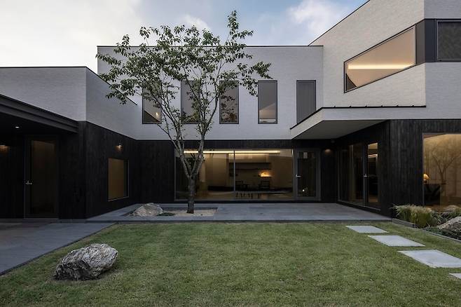 일층의 어두운 적삼목 마감이 왕벚꽃과 잔디가 섬세하게 어우러져, 자연 소재의 따뜻함을 더해 건축물에 모던하면서도 포근한 느낌을 부여하고 있습니다. 주택 디자인에서의 조경은 아주 중요합니다. 절대로 대충 하거나 넘어갈 수 없는 부분이에요. 어떻게 조경으로 마무리하느냐에 따라 집의 퀄리티가 올라가고 내려갑니다.