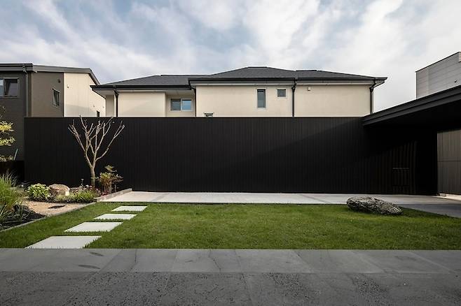 집 외관의 가장 큰 포인트는 베이지색 세라믹 사이딩 본체에 검은색 스테인리스스틸 루버로 벽과 대문을 마감한 것이에요.