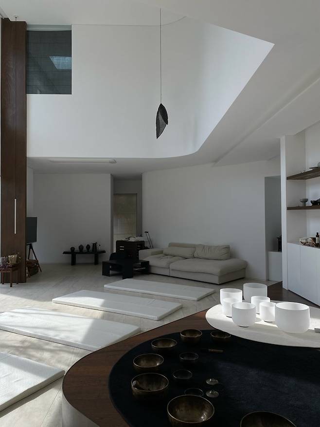 집 공간에서 차실과 함께 가장 많은 시간을 보내는 공간인 거실입니다. 주중에는 가족들이 1층 거실에서 시간을 보냅니다. 주말에는 사운드 명상 세션이 있어서 손님들께 내어 드립니다. 퇴근하고 가족이 모두 모였을 때 하루 있었던 이야기를 나누고 일정을 소화한 다음 이층 침실로 올라가서 잠을 자는 게 매일 같은 루틴입니다.