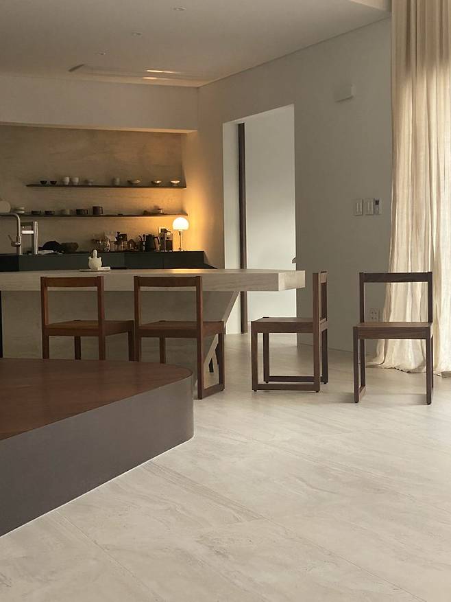 새집의 느낌이 아니었으면 했기 때문에 자연 트라버틴 패턴과 색 고재 나무의 짙은 갈색으로 맞췄습니다. 되도록이면 원목을 쓰려 노력했고요. 벽체들은 둥글게 라운딩 했어요. 너무 각지고 반듯한 구조보다는 유연하고 비정형스러운 모습을 갖추길 원했습니다.