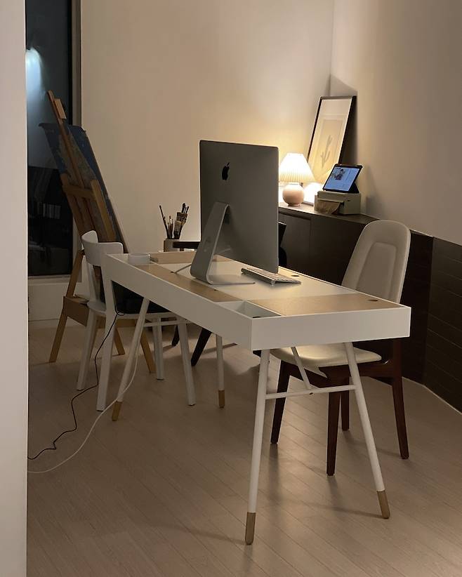 샤워를 하거나 잠들기 전 가장 창의적이거나 생각이 많은데 자려고 누워있다가 번뜩이는 아이디어를 적거나 서치 하려면 작은 서재가 필요하다고 느꼈어요. 저 혼자 앉아서 책 한 권 필 정도의 아주 작은 책상이면 충분하다고 생각했습니다.