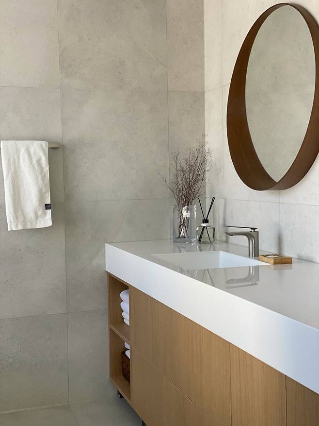반신욕을 즐길 수 있는 이층 욕실, 작은 타일이 아닌 큰 타일로 줄눈의 수를 줄여 심플한 느낌을 더 했습니다. 우드 톤도 조금 더 밝은 이층 욕실의 세면대와 하부장, 인조대리석 상판을 이음새 없이 하나의 판으로 했습니다.