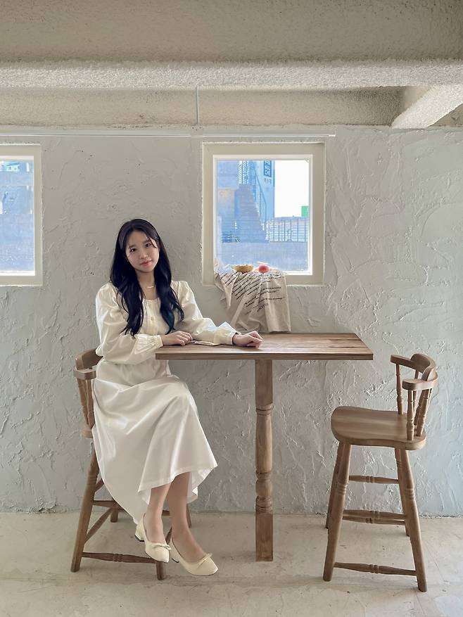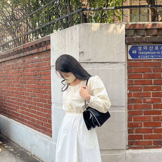 크림색 블라우스에 흰색 플레어스커트를 착용하니
