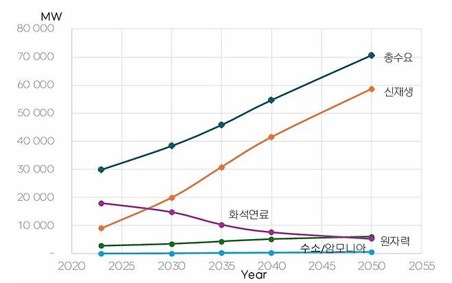 전기화 추세에 따라, 전세계 전력 수요는 2023년 약 30,000 TWh에서 2050년 70,000 TWh로 두 배 이상 빠르게 증가할 것으로 보인다. 전력원도 현재 화석연료 발전 중심에서 태양광이나 풍력과 같은 신재생 발전으로 변환돼, 2050년이면 총 발전 수요의 80% 이상이 신재생 발전일 것으로 추정된다 (그림 2). 여기에 최근 몇 년 사이 인공지능(AI) 기술이 비약적으로 발전하면서, 전력 수요는 전례 없이 급증하고 있다.