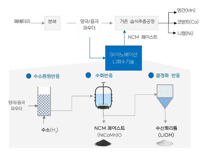 그러나, 니켈이나 코발트는 습식법으로 비교적 쉽게 분리 생산이 가능한 반면, 리튬은 기존 기술로는 경제적으로 분리하기 어려워서 새로운 연구가 많이 진행되고 있다. 이 가운데 SK이노베이션이 개발한 유동층 반응기를 통한 수소환원 및 수화 공정으로 수산화리튬(LiOH)을 분리생산하는 기술은 세계 최초로 개발돼 실증 규모 플랜트를 통해 그 효과성이 검증됐다. 이 기술의 개략도는 다음과 같다 (그림 6).