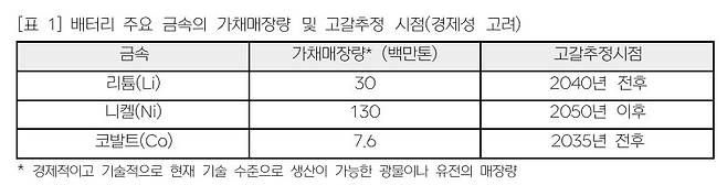 이런 대규모 배터리 수요를 충족시키기 위해 필요한 금속 자원은, 리튬(Li), 코발트(Co), 니켈(Ni), 망간(Mn) 등이다. 이들 가운데 망간을 제외하곤 모두 매장량이 한정돼 있으며, 고갈 시점이 그다지 멀지 않았다는 미국지질조사국(USGS, United States Geological Survey)의 보고도 있다 (표 1). 고갈 문제는 매우 심각하기 때문에 기존의 리튬 이온 배터리를 대신할 나트륨(Na) 이온 배터리를 개발해야 한다고 주장하는 연구자도 있다. 그러나, 아직은 리튬 이온 배터리를 대신할 만한 차세대 배터리 기술 개발은 요원하다.