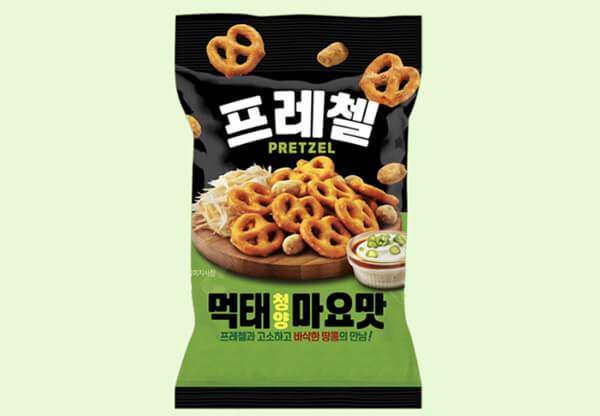 프레첼은 서구권에서 흔하게 먹는 빵 또는 과자다. 독일이 원산지인 간식으로, 국내에서는 주로 과자 형태의 딱딱한 식감을 가진 것들이 판매되고 있다. 새로 출시된 ‘프레첼 먹태청양마요맛’은 요즘 유행하는 먹태청양마요의 맛을 가미한 과자다. 알싸한 먹태청양마요 시즈닝과 고소한 프레첼, 그리고 땅콩이 조화를 이루는 봉지과자 제품이다. 한 봉지의 용량은 85g이며, 가격은 온라인 판매가 기준 900원이다.