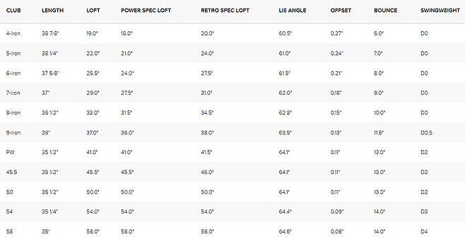 로프트: 4-9, PW(41°), 45.5°, 50°, 54°, 58°(라이각) 핑 컬러 코드에 따라 주문 가능. 블랙 컬러 코드가 기본.