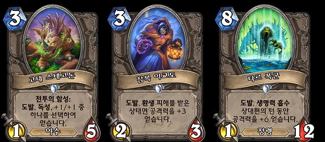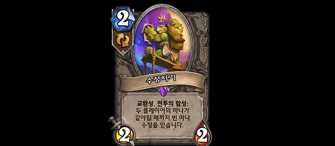 먼저 볼 것은 2마나 2/2 하수인 [수정지기]다. 교환성 및 전투의 함성으로 두 플레이어의 마나가 같아질 때까지 빈 마나 수정을 얻는 효과를 가졌다.