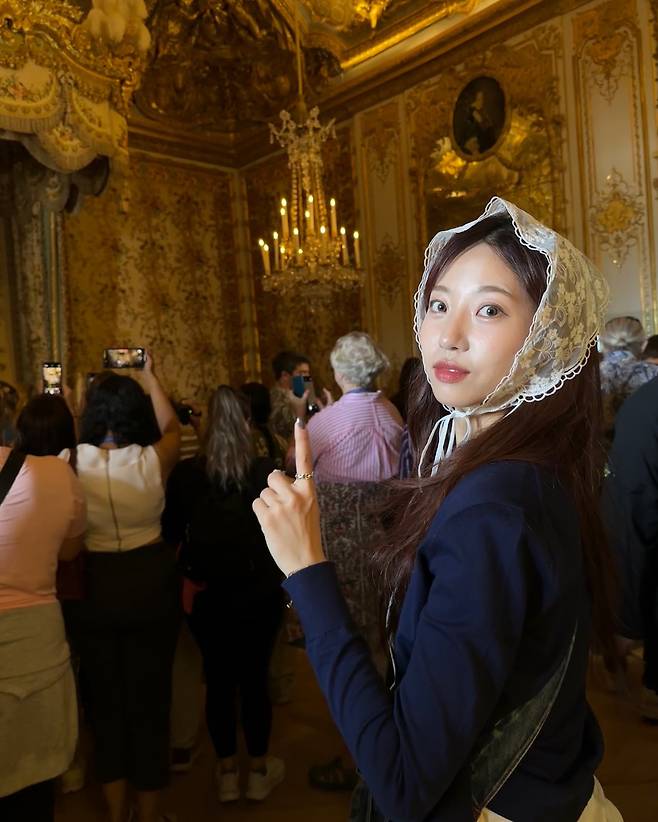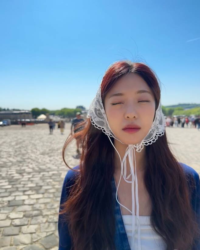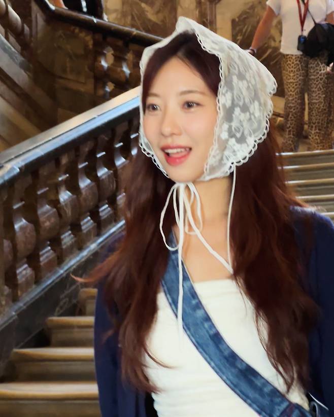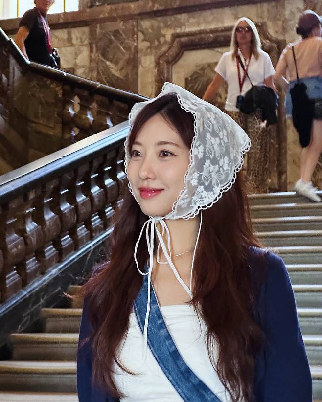 레이스 보닛을 머리에 살짝 얹은 모습은 고전적인 무드와 동화적인 분위기를 동시에 자아냈고, 이국적인 계단을 배경으로 한 연출이 룩을 더욱 특별하게 만들었어요.