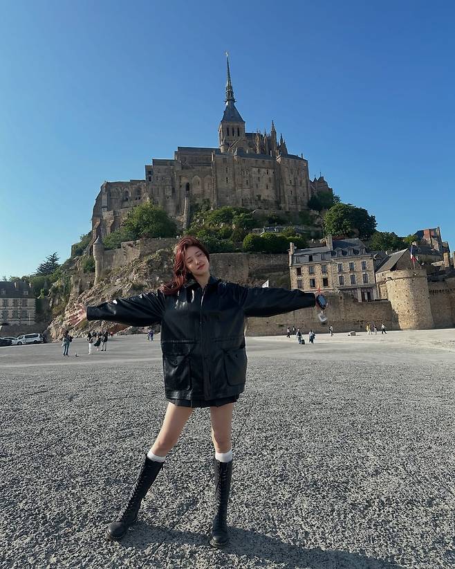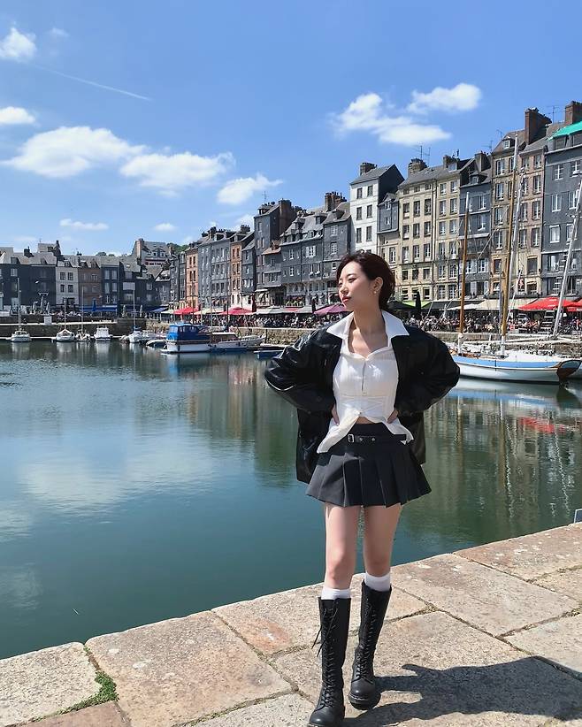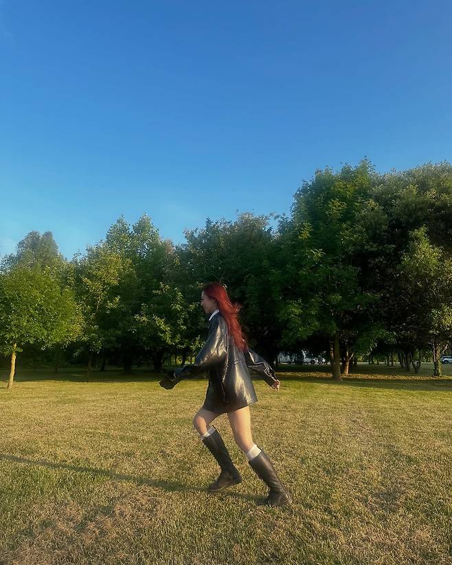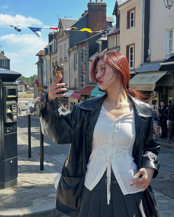 외출 컷에선 블랙 가죽 재킷과 주름 미니스커트로 분위기를 완전히 반전시키며, 한층 시크한 무드를 드러냈어요.