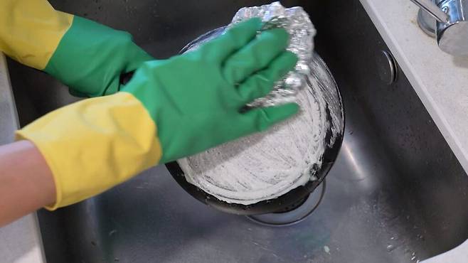 이제 은박지를 적당한 크기로 잘라 문질러 주세요. 은박지는 금속 재질이라 기름때와 탄 자국을 긁어내기 좋고, 철 수세미보다 위생적으로 사용할 수 있습니다. 원을 그리며 닦아 주면 탄 자국과 기름때가 깨끗하게 제거됩니다.