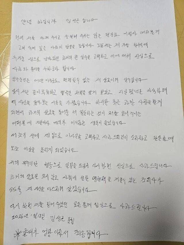 임성근은 영상에서 “술을 마시면 차에서 자는 버릇이 있었다”며 “운전한 게 아니라 쉬고 있다고 생각했지만, 시동을 켜고 운전석에 앉아 있으면 음주운전에 해당한다는 걸 몰랐다”고 설명했다. 가장 최근 적발은 5~6년 전으로, 당시 면허 취소 처분을 받았고 이후 재취득했다고 밝혔다. 최근에는 한 잔만 마셔도 대리운전을 이용한다고 덧붙였다. 그는 “숨기고 싶지 않았다. 잘못은 잘못”이라며 자필 사과문까지 공개해 책임을 인정했다.