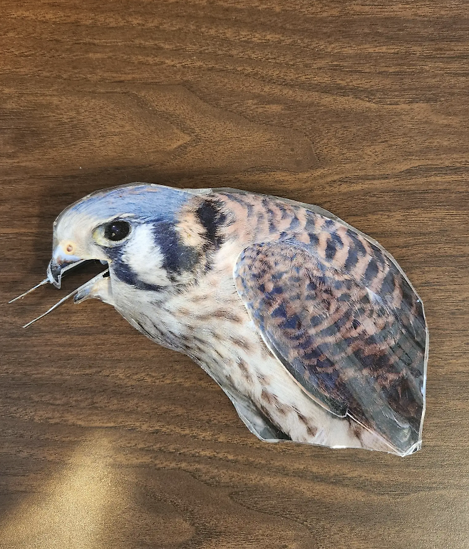 “Jenn은 기본적으로 성체 황조롱이의 고해상도 사진(수컷 한 마리와 암컷 한 마리)을 두꺼운 공예용 종이에 출력한 다음, 집게에 붙였을 때 3D처럼 보이도록 잘라서 디자인했습니다.”라고 길레스피가 말했습니다. “그녀는 또한 인쇄물을 라미네이팅하여 쉽게 닦고 소독하며, 향후 환자나 식사 사이에 재사용할 수 있도록 했습니다.”