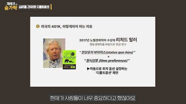 2017년 노벨경제학상을 탄 리처드 탈러는 행동경제학에 기반한 퇴직연금 설계를 제안했고, 실제 미국의 퇴직연금 401K는 탈러의 연구에 기반해 작동하고 있다. 김 교사는 “사람들은 기본값을 잘 바꾸지 않는 경향이 있다”며 “미국의 퇴직연금은 강제 가입이고, 가입자가 바꾸지 않는 한 자동으로 TDF에 가입되게 돼있다”고 했다. TDF는 타깃 데이티드 펀드(Target dated fund)의 약자로, 목표로 한 은퇴시점에 맞춰 자산배분 비율을 자동으로 조정하는 상품이다. 젊었을 때는 변동성이 높은 주식 투자 비중을 늘리고, 은퇴 시점이 가까워지면 변동성이 낮은 채권 투자 비중을 높이는 식이다.