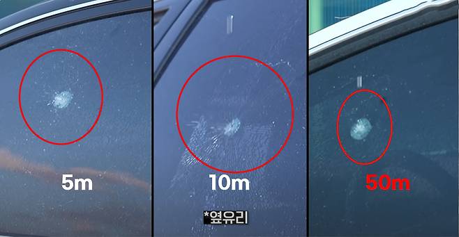 옆유리에도 마찬가지로 거리별로 새총을 쏴보았는데요 근거리는 당연히 심하게 파괴되었고 앞유리보다 더 작은 크기의 유리라 더욱 조준하기 힘들었던 50m 거리였지만 적중했을 때 동일하게 파괴된 모습을 보였습니다.