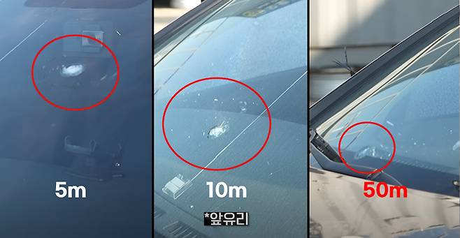 먼저 앞유리에 새총을 쐈을 때 손상 모습을 확인해보자면 1m와 10m는 가까운 거리이니 만큼 손상이 심했지만 50m의 경우 거리가 너무 멀어 조준조차 쉽지 않았지만 새총의 쇠구슬이 적중했을때는 근거리와 마찬가지로 심한 손상을 입은걸 볼 수 있었습니다.