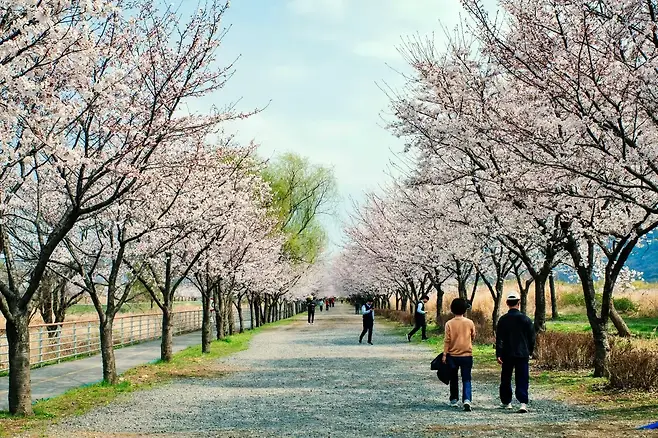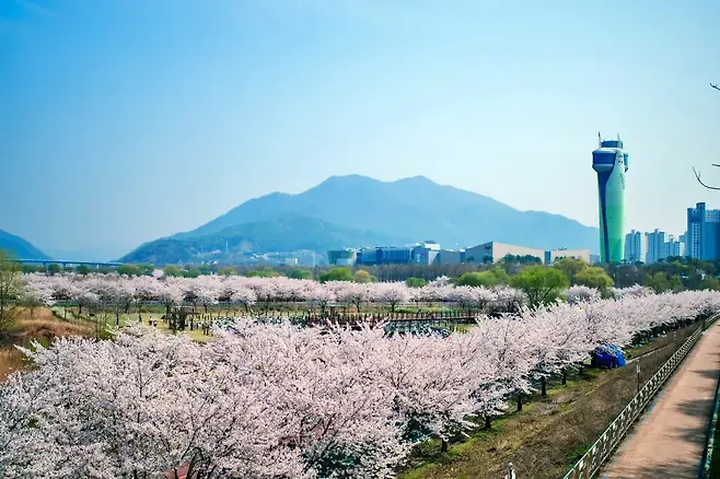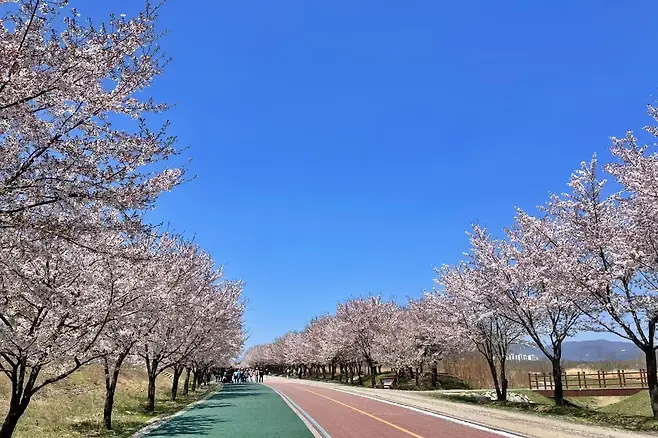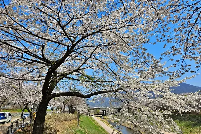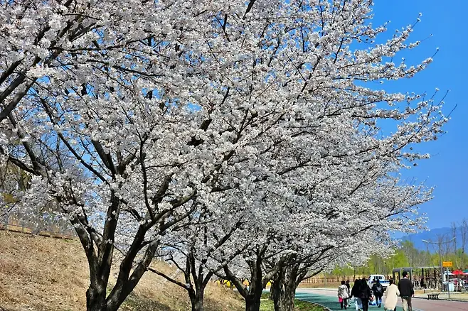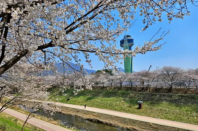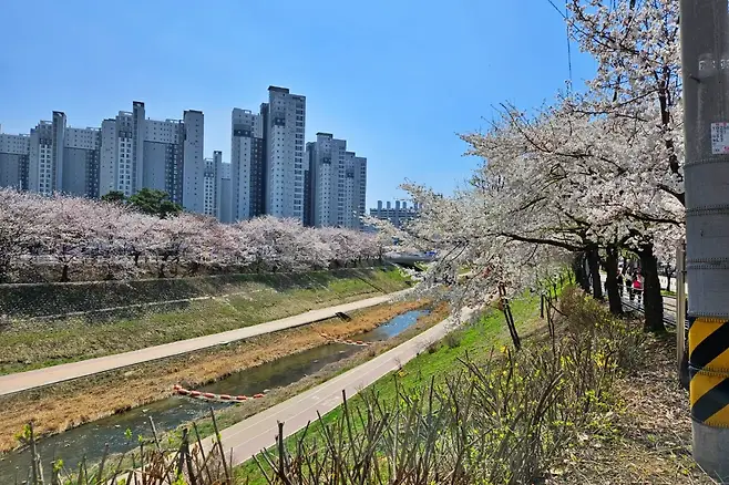 덕풍천 산책로는 강변을 따라 길게 이어진 벚꽃 터널로, 곳곳에 데크와 인라인길이 마련돼 있다. 꽃잎은 일부 떨어졌지만 여전히 나무마다 꽃이 매달려 있어, 흩날리는 꽃비를 맞으며 걷는 낭만적인 코스다.