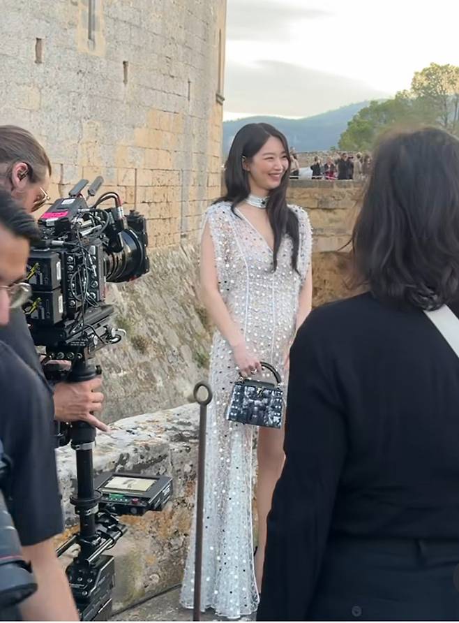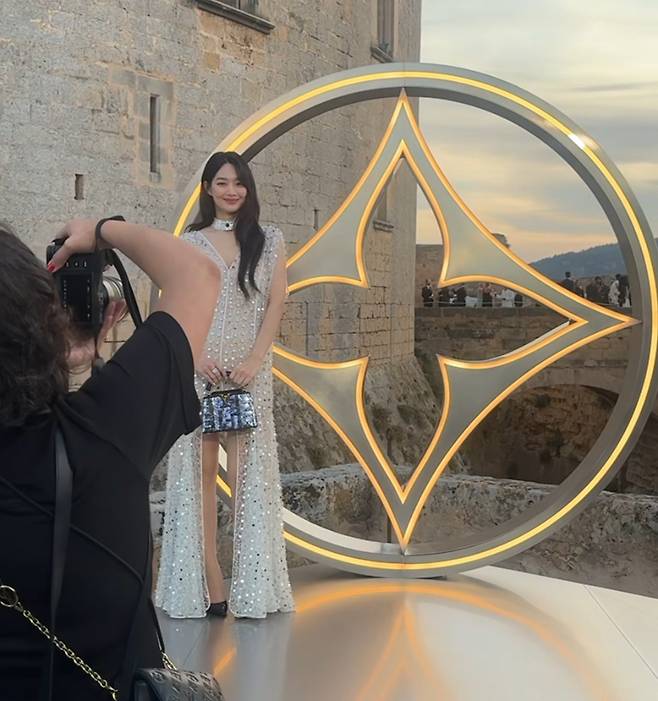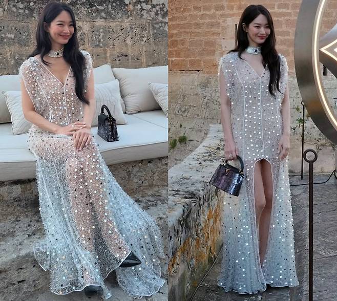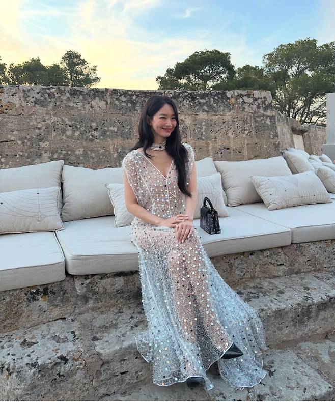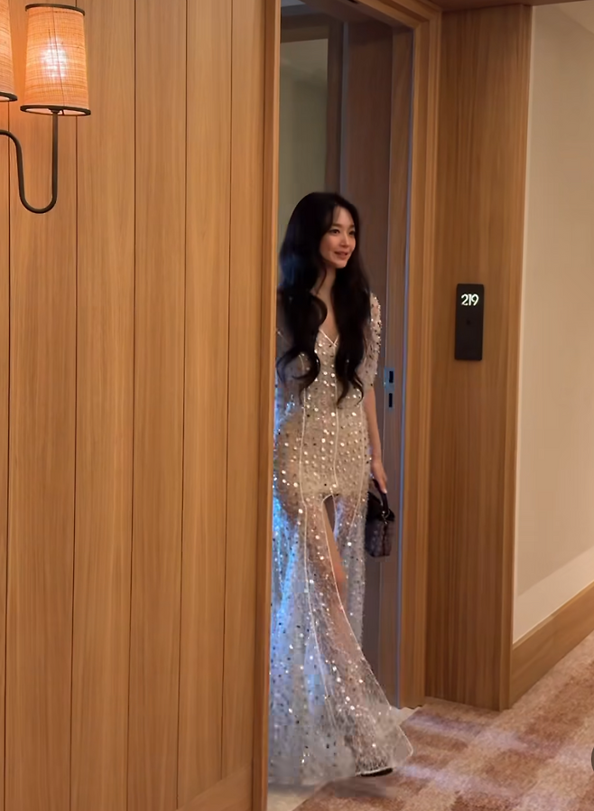 전체적으로 시퀸과 비즈 장식이 빛나는 시스루 드레스를 착용해 고급스러운 글램룩을 완성했으며, 실루엣을 따라 자연스럽게 흐르는 소재가 그녀의 우아한 체형을 부각했습니다.