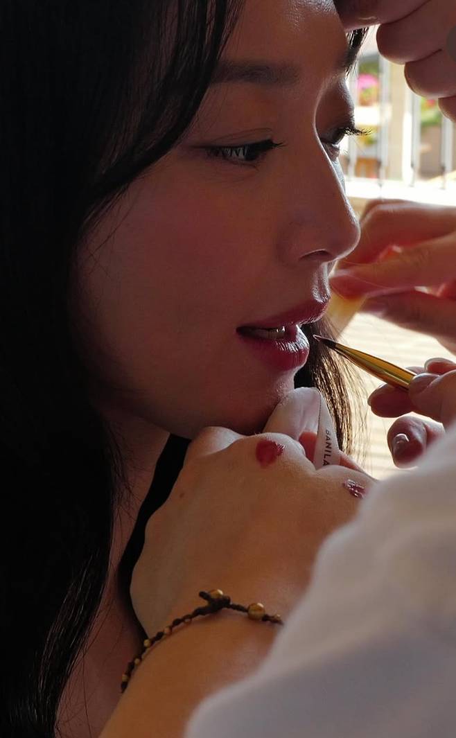 앞 트임 디테일로 절제된 관능미를 더했고, 클래식한 블랙 부츠를 매치해 유니크한 믹스 매치를 시도했습니다.