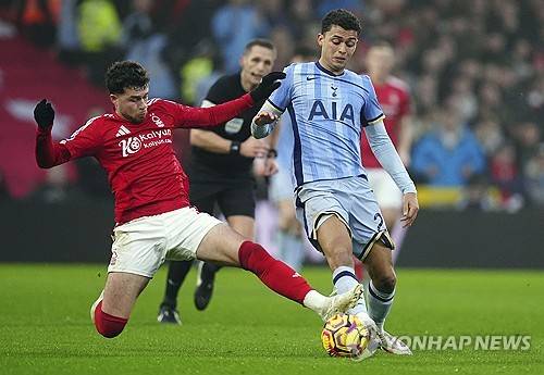 Tottenham Hotspur's Brennan Johnson and Nottingham Forest's Neco Williams, left, challenge for the ball during the English Premier League soccer match between Nottingham Forest and Tottenham Hotspur at the City Ground stadium in Nottingham, England, Thursday, Dec. 26, 2024. (Mike Egerton/PA via AP) UNITED KINGDOM OUT; NO SALES; NO ARCHIVE; PHOTOGRAPH MAY NOT BE STORED OR USED FOR MORE THAN 14 DAYS AFTER THE DAY OF TRANSMISSION; MANDATORY CREDIT