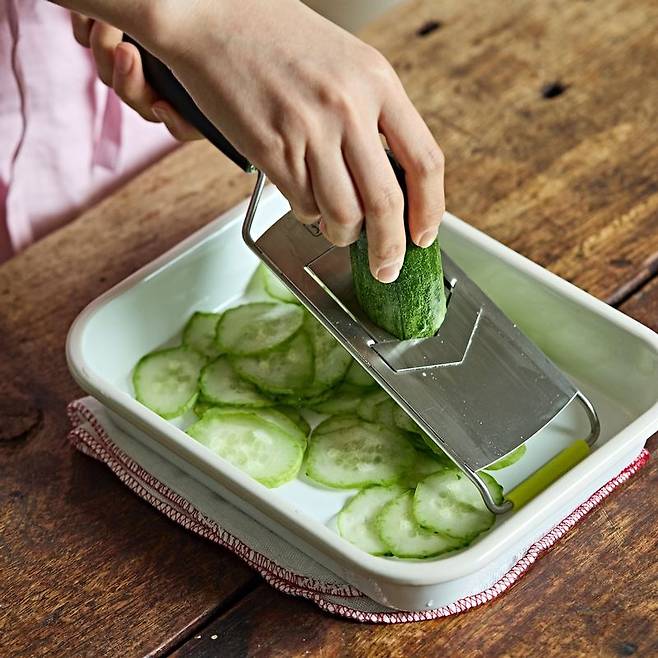 1. 오이는 모양대로 얇게 자른후 소금에 5분 정도 절인다. 물기를 꽉 짠다.