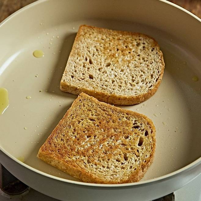 .3. 달군 팬에 곡물식빵을 앞뒤로 노릇하게 구운다.