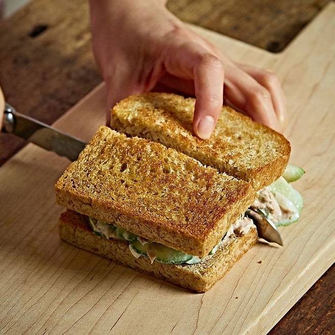 빵은 정제된 흰 빵보다 건강한 곡물빵을 사용하면 좋습니다. 통곡물의 고소한 맛이 참치마요 소스와 잘 어울립니다. 몸에도 혈당을 빨리 올리는 흰 빵보다 이롭습니다.