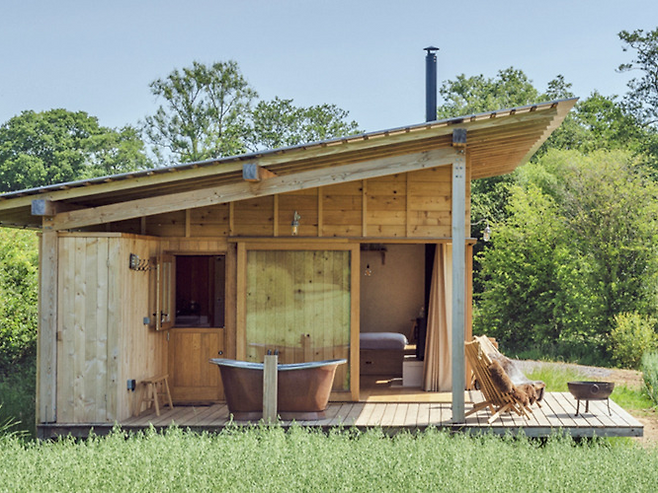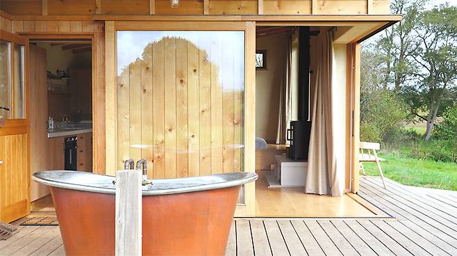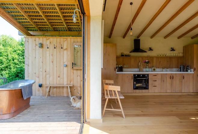 가장 드라마틱한 요소는 단연 청동색 욕조다. 침실 끝쪽의 커다란 창 너머로 연결된 야외 욕조는, 거대한 옥수수밭 사이에서 온전히 자연과 눈을 맞추는 목욕 경험을 선사한다.