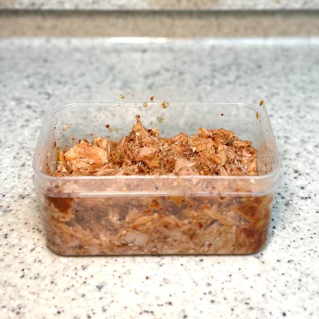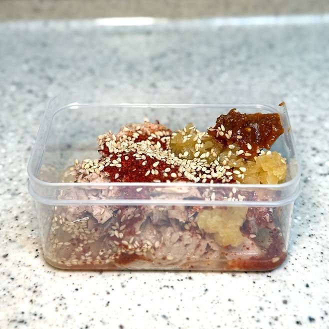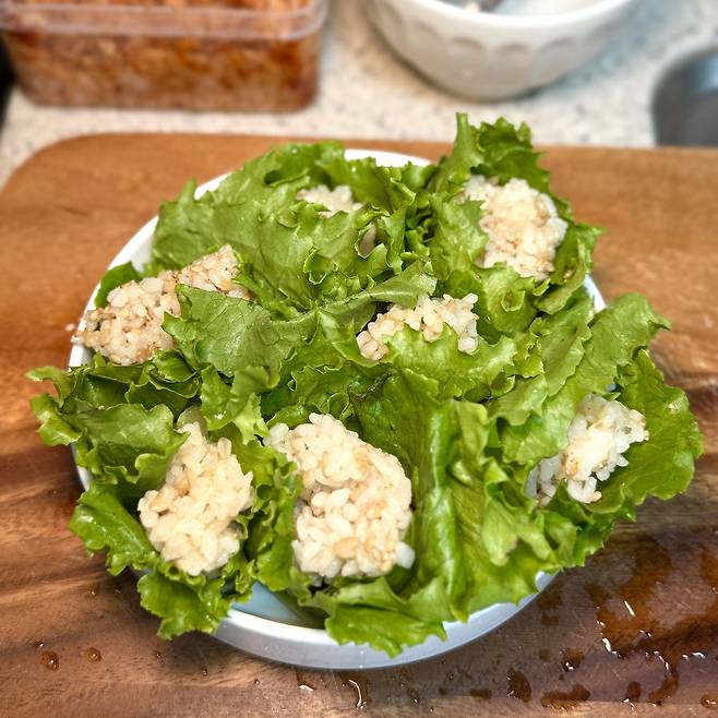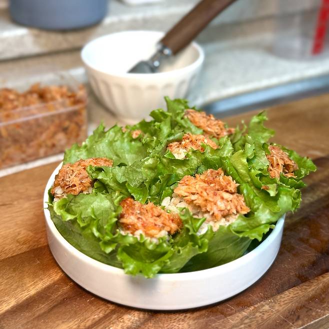 참치캔 1개, 고춧가루 1스푼, 깨소금, 알룰로스 2스푼, 다진마늘 1스푼, 쌈장 0.5스푼, 상추 7장, 밥 1공기