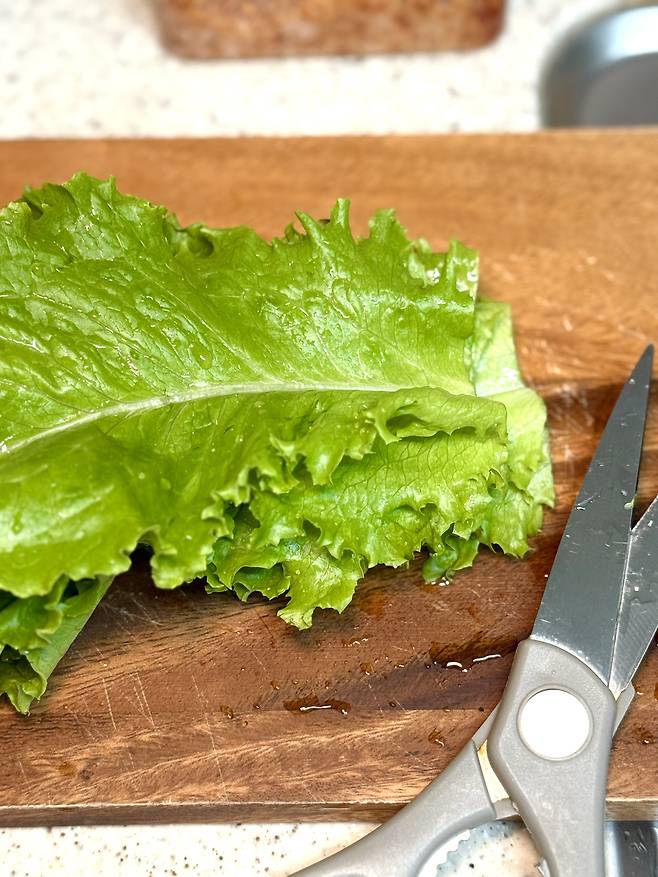 1인분만 만들 계획이라 상추는 7장 준비했어요. 아무래도 쌈밥 용이라 더 신경써서 세척했습니다. 물에 식초 1스푼 타놓고, 상추를 담가놨다가 헹궈줬어요.이제 세척한 상추를 손질합니다. 끝 부분은 가위로 잘라주고요. 상추의 가운데 선을 잘라줄게요. 2/3만큼이나 잘라주세요. 자르는 이유는, 상추에 참치쌈장을 올리면, 이해되실거에요 :)
