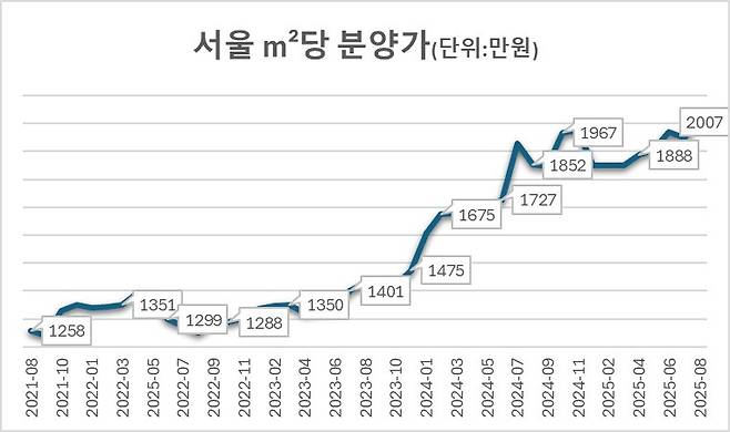 ㎡당 분양가는 2021년 8월 1258만 원이었다가 코로나 여파로 분양시장이 침체되면서 2022년 8월 1250만 원으로 하락했다. 이어 2023년 8월에는 1년 새 14.33% 오른 1430만 원을 기록, 지난해 8월에는 1852만 원으로 오른 뒤 1년 만에 2000만 원 선을 넘어선 것이다.