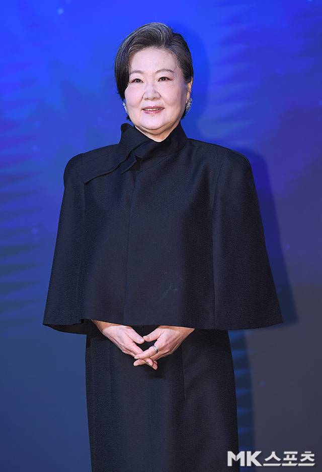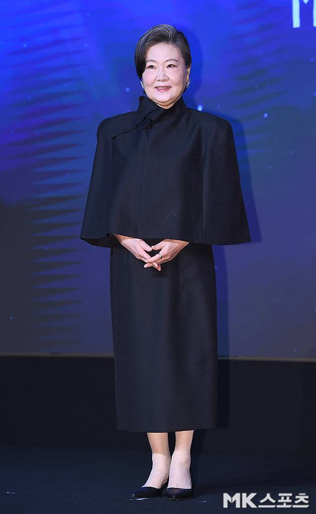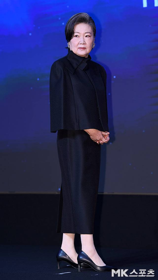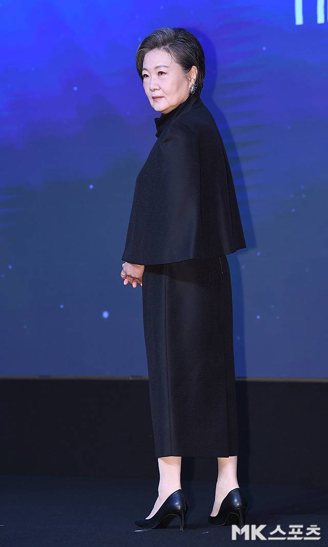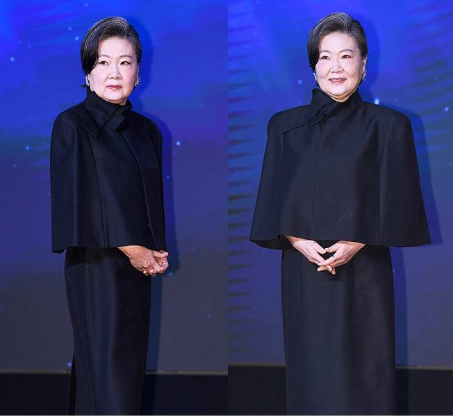 김해숙은 미니멀리즘이 돋보이는 올블랙 룩을 선택해 품격 있는 분위기를 자아냈습니다.