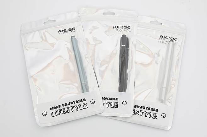 모락 초미세 터치펜 MR-TP-00의 경우 가성비를 최대한 살리기 위해 박스 포장을 사용하지 않고 지퍼백 포장을 선택하고 있다. 색상은 블랙과 실버, 그레이 3가지가 있다.