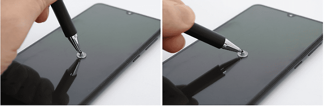 초미세팁의 경우 투명 디스크와 펜 몸통이 연결된 부분이 유연하기 때문에 어떠한 각도에서도 디스크가 화면에 밀착해 정교한 드로잉이나 필기가 가능하다.