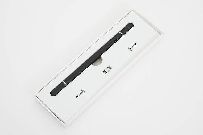 박스를 열어보면 투포인트 정전식 초미세 터치펜과 세 개의 교체용 팁이 제공된다. 교체용 팁은 두 개의 초미세팁과 하나의 섬유볼로 구성되어 있다.