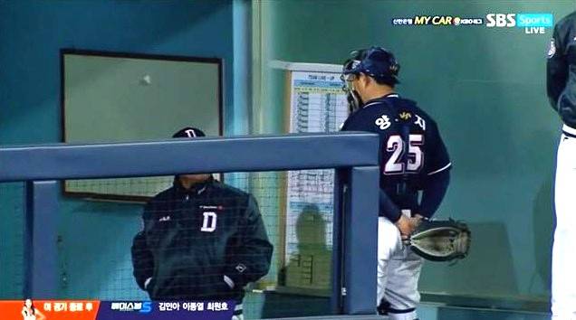포수 양의지가 즉각 불려 간다. 그리고 덕아웃 앞에서 열중쉬어 자세가 된다. 군기가 바짝 든 모습이다.