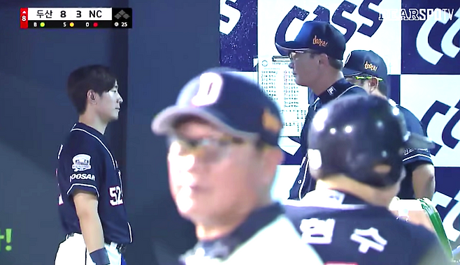 그런데 갑자기 덕아웃 분위기가 쎄~하다. “야, 너 이리 와봐.” 심상치 않은 호출이다. 김재호 앞에 투명한 커튼이 드리워진다. 부동자세로, 눈도 못 마주친다. 묵직한 훈시가 이어진다. 이 장면은 중계 화면에 그대로 담겼다.