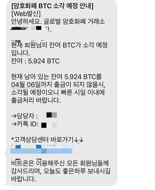5일 익명의 가상자산 투자자에게 받은 사진에 따르면 코인 거래소라고 자칭하고 수신자가 보유한 비트코인(BTC)이 소각 될 예정이라며 출금처리를 해야 한다는 스미싱 문자가 발송되고 있다.