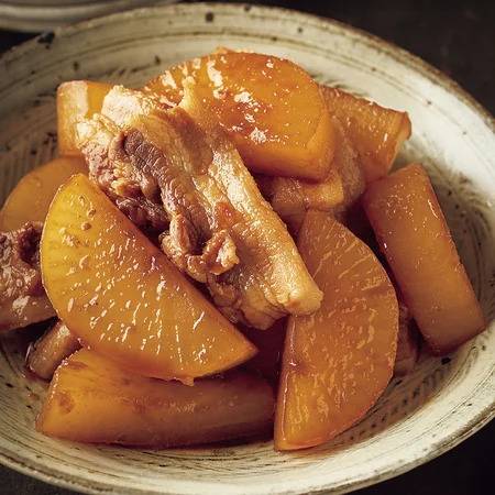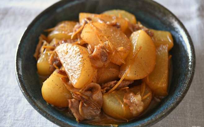 무 600g(약 1/2개), 돼지고기 삼겹살 또는 앞다리살 150g, 생강 20g, 참기름 1작은술, 다시마·멸치 육수 400ml, 설탕 1.5큰술, 간장 2큰술, 후추 약간