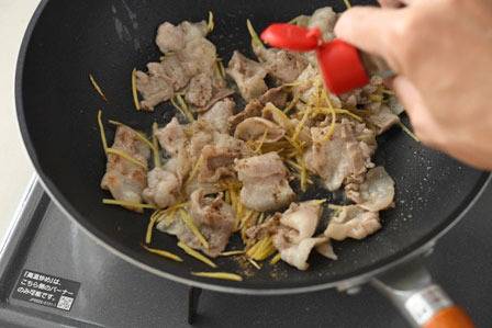 3. 팬에 참기름과 생강을 넣어 중불에서 볶다가 향이 올라오면 돼지고기를 넣어 색이 변할 때까지 익힌다. 소금, 후추로 살짝 밑간한다.