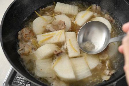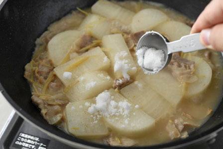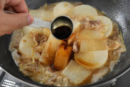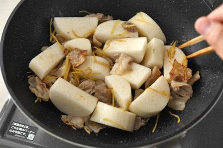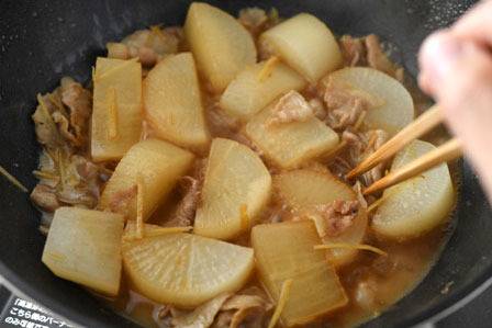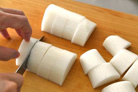 무는 껍질 바로 아래에 섬유질이 많아 두껍게 깎아내는 것이 부드러운 식감을 낸다. 무와 돼지고기를 함께 볶아 기름을 입힌 뒤 육수를 넣어야 맛이 잘 스며든다.