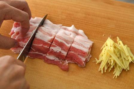 2. 돼지고기는 3~4cm 크기로 자르고, 생강은 채 썬다.