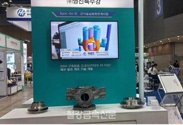 지난해 6월 1일부터 내년 5월 31일까지 2년 동안 민군협력진흥원이 지원하는 과제를 수행 중인 영신특수강은 10월 30일부터 11월 2일까지 일산 킨텍스 제1전시장 2, 3홀에서 개최된‘2024 아시아 기계 & 제조 산업전’에서 슈퍼 듀플렉스 STS 기반의 해수 펌프 부품을 선보였다.