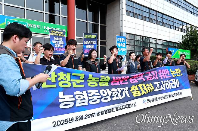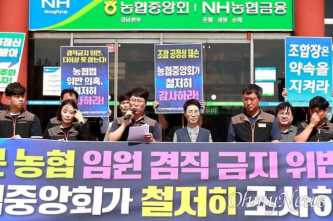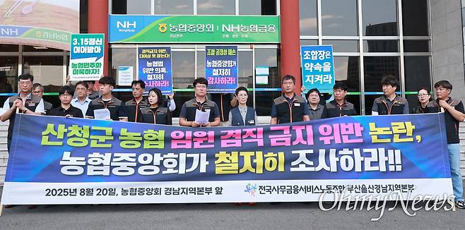 | ▲ 민주노총 전국사무금융서비스노동조합 부산울산경남본부는 20일 오후 농협중앙회 경남본부 앞에서 기자회견을 열어 '산청군농협 임원 겸직 금지 위반 논란'에 대한 진상조사를 촉구했다. |