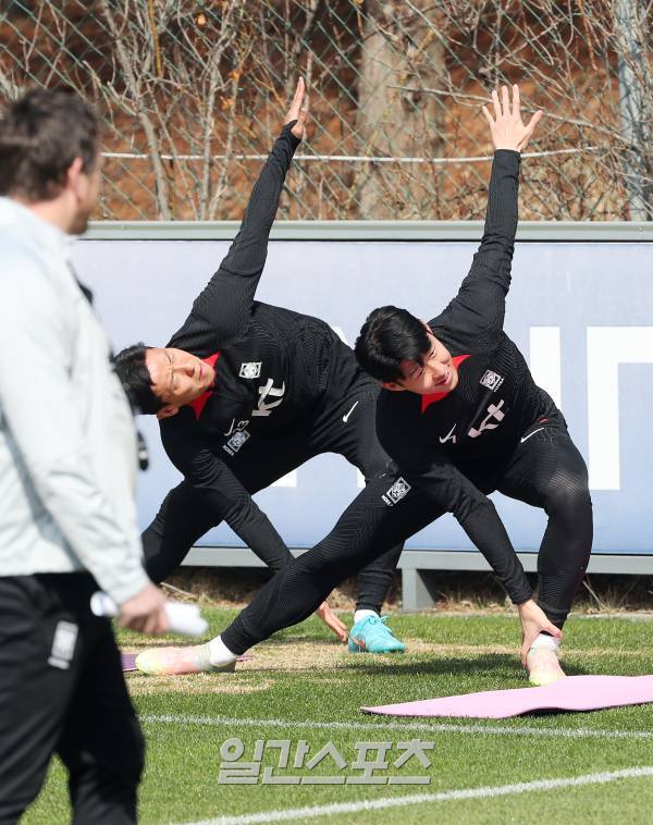 21일 오전 경기도 파주트레이닝센터(NFC)에서 진행된 축구국가대표 훈련에서 손흥민 등 선수들이 스트레칭을 하고 있다.
